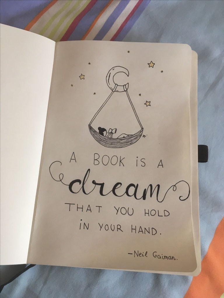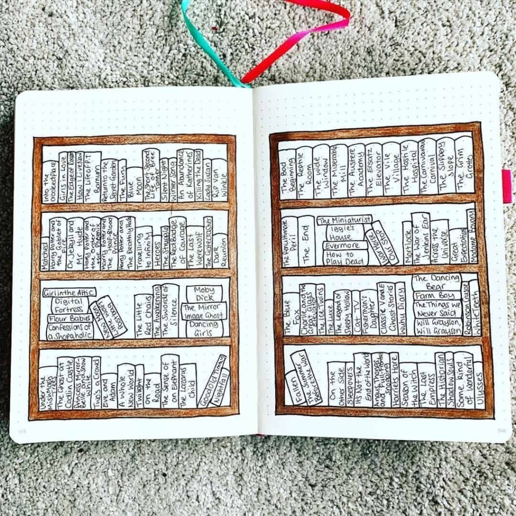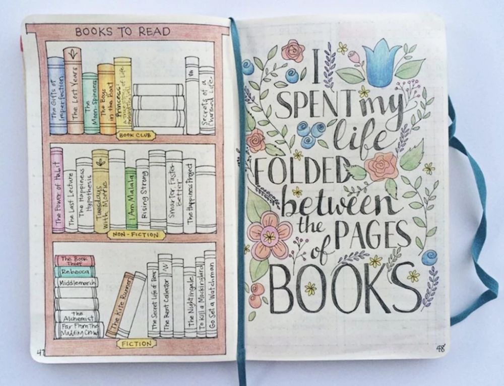 This page looks like a lot of work, but then again, bullet journaling are meant to relax you by using colors and drawing objects. This idea is great because it shows the many different types of books, and the classic looks of books from the 19th century.