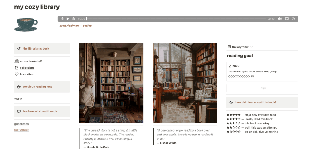 On the top half, you see a dashboard view of your reading in one page. With a mellow song on the top, this template comes with links to pages to where you can create your own spreadsheets to the books you have on your bookshelf, collections, and your favorites. You also have access to your Goodreads, and story graphs followed next to two homey kind of library pictures. Then on the left you have a reading goal that creates a chart based on the spreadsheet below.