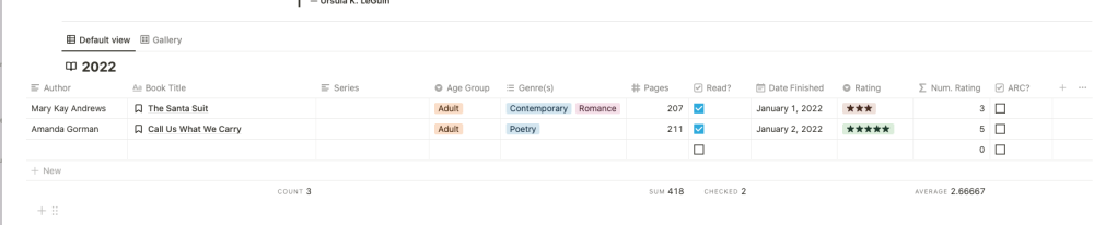 And then right below, you can keep track of the books you read along with the dates, rating, and arcs, and if you open the page to one of the entries, it atomically uses the template to write your own thoughts and feelings about the book. It reads just like a book diary.