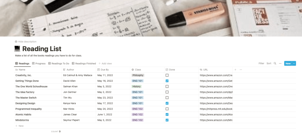 I created this notion spreadsheet for those who have mandatory readings to keep track of. This is for the college students who need to keep track of their readings all in one place.